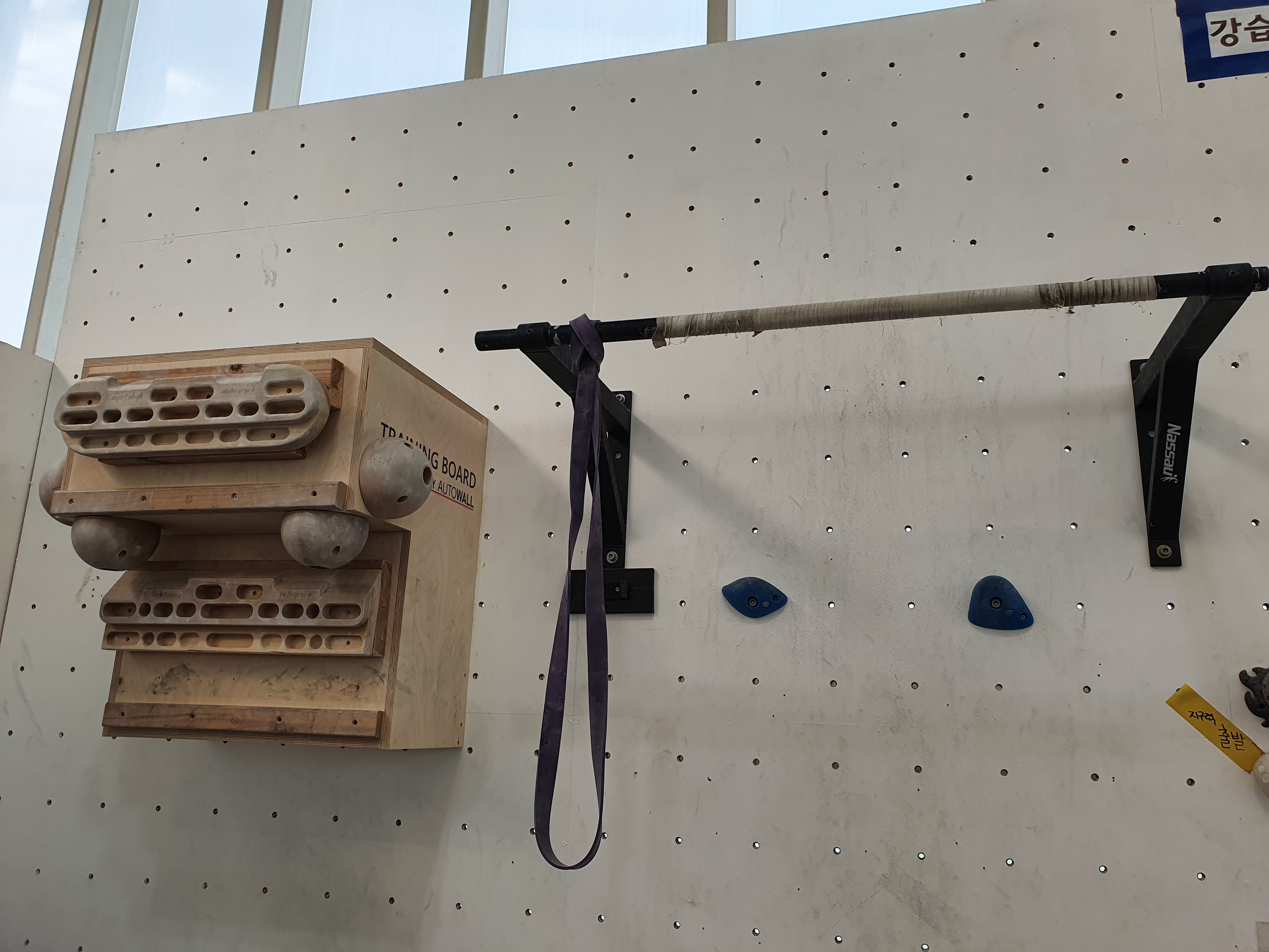 왼쪽 기구는 이날 처음본건데, 손가락을 걸고하는 턱걸이 기구입니다. 손가락힘, 발가락힘을 쓸일이 많은 운동인 것 같아요.