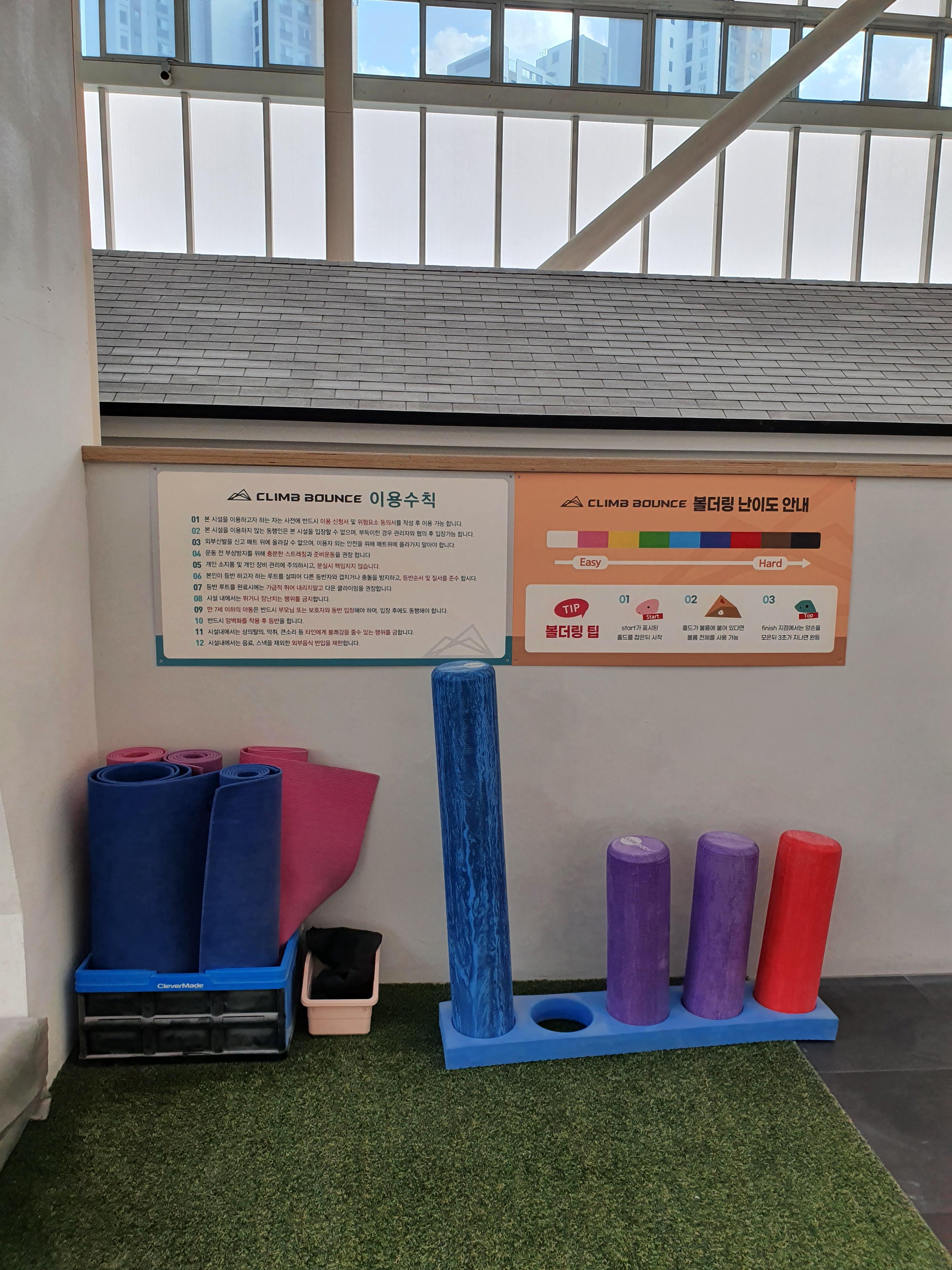 폼롤러를 자유롭게 이용할 수 있습니다. 기둥에 새겨진 컬러는 코스 난이도를 의미합니다. 흰색이 가장 쉽고 위로 올라갈 수록 어려운 코스를 의미해요.