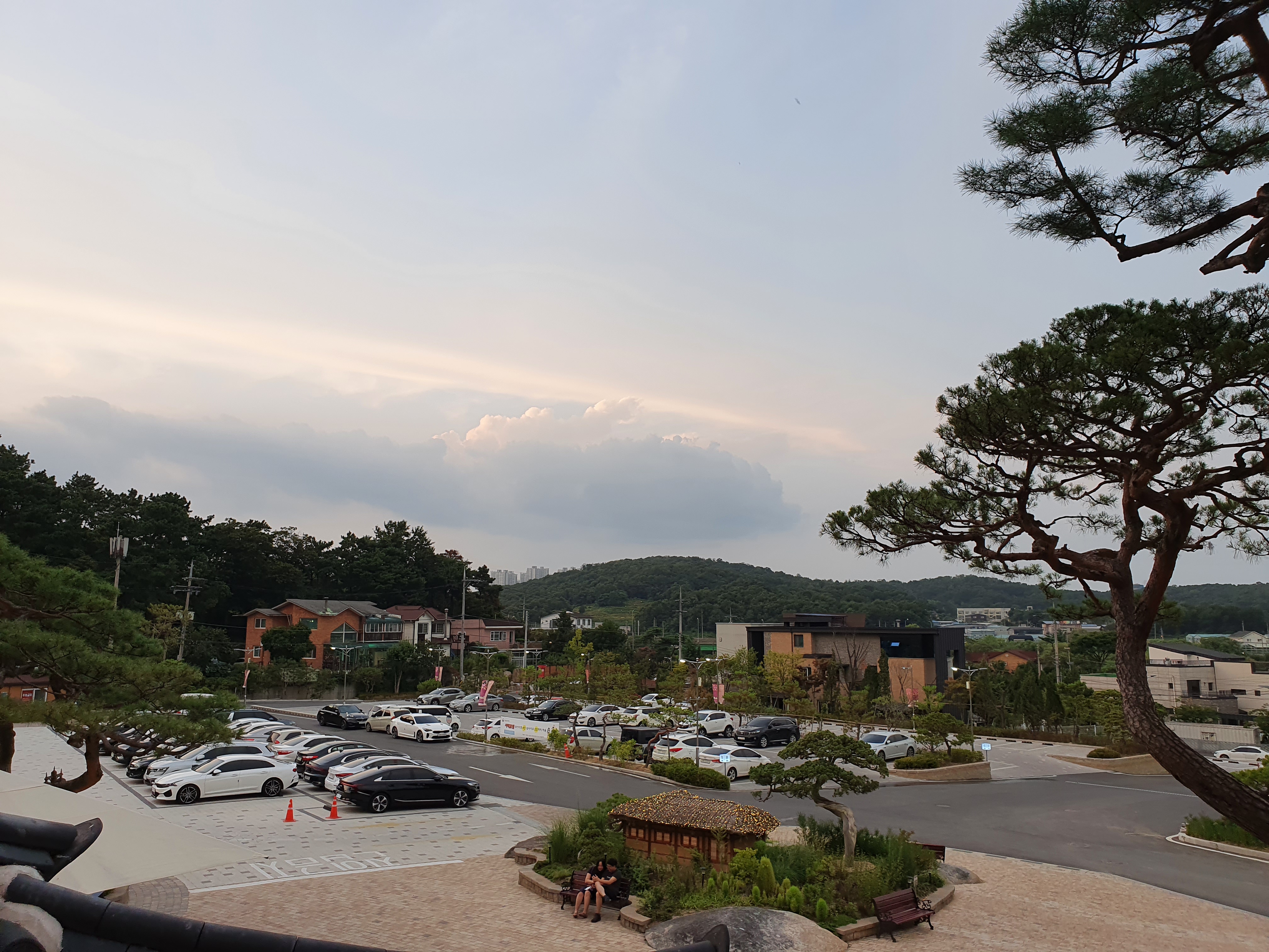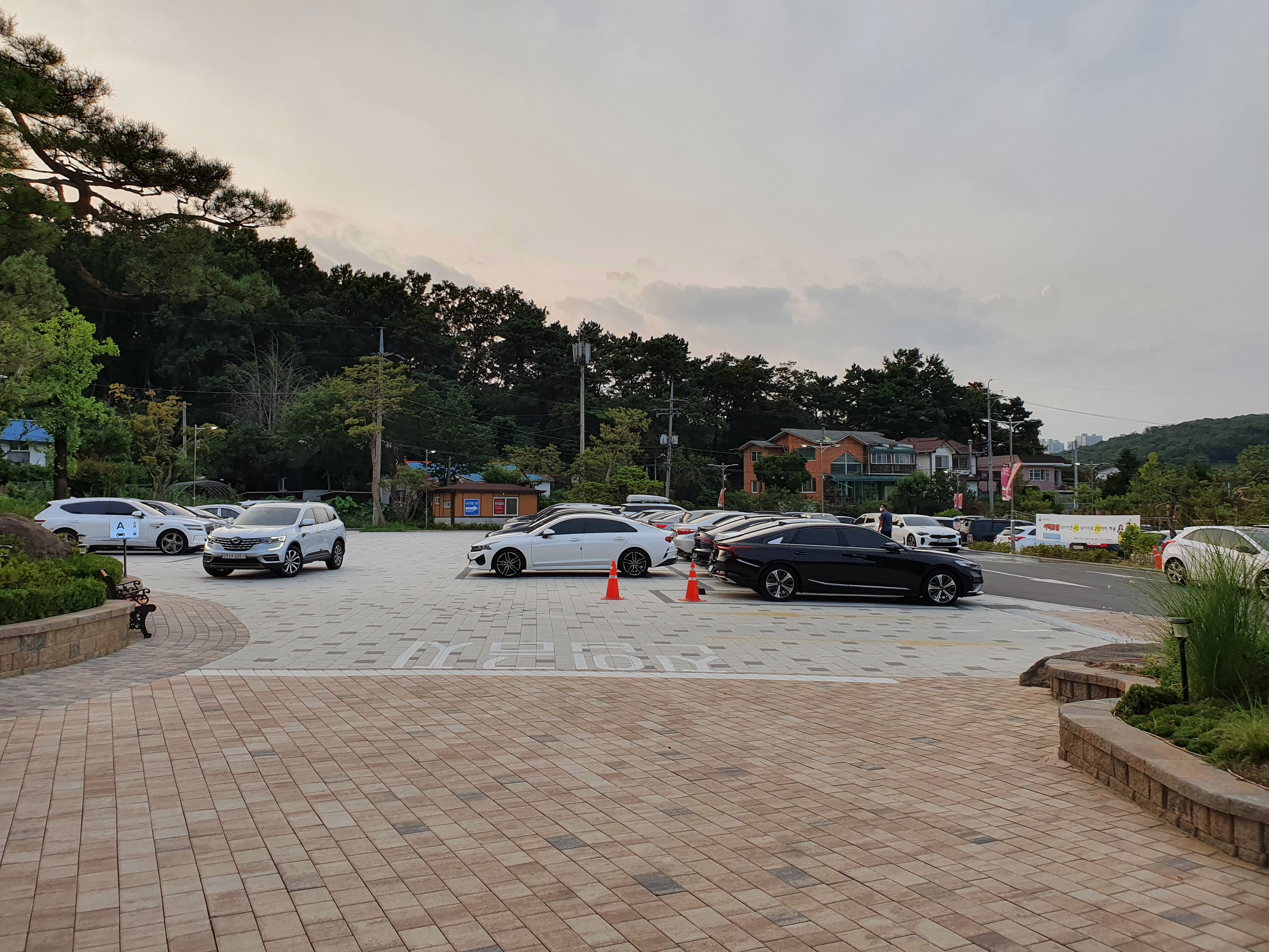 2층에서 본 주차장. 주차장 너머로 가운데 보이는 산이 융건릉이 있는 산이다. 융건릉 숲길과 함께 오는 것도 괜찮을 듯하다. 나와 아내는 융건릉 산책을 종종 간다. 융건릉은 찐추천 산책로다.